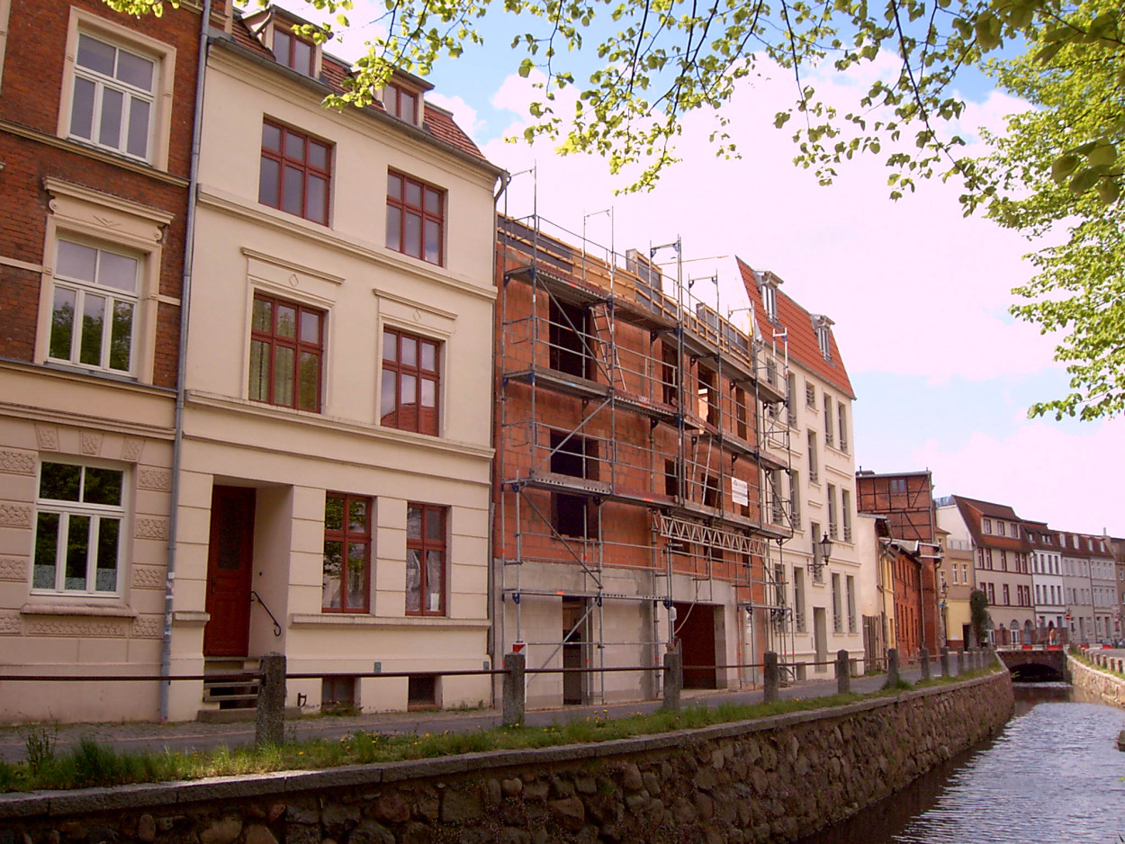 Trotz der vielen Schwierigkeiten und Herausforderungen entstanden auf dem schmalen Grundstück die vom Bauherrn gewünschte Garage und die 3 Wohnungen, die nur mit natürlichen Materialien gebaut wurden. Die Außenwände wurden mit Porotonziegeln gemauert, der Innenputz in den Wohnungen ist aus Lehm, im Treppenhaus aus Kalk, alle Wohnräume haben Dielenfußböden und sämtliche Innentüren sind alte Holztüren, die für die neue Nutzung aufgearbeitet wurden. Die vom Bauherrn gewünschten schrägen Fensterleibungen wurden aufwändig mit Holz verkleidet. Alle Fenster sind Holzfenster, deren Flügel nach außen aufgehen. Die niedrigen Fensterbrüstungen geben einen guten Blick auf die "Frische Grube" frei.
